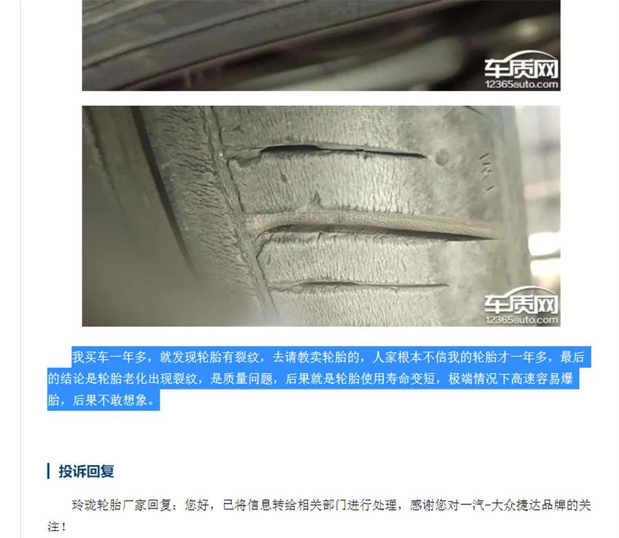 “我买车一年多,就发现轮胎有裂纹,去请教卖轮胎的,人家根本不信我的轮胎才一年多,最后的结论是轮胎老化出现裂纹,是质量问题,后果就是轮胎使用寿命变短,极端情况下高速容易爆胎,后果不敢想象”;