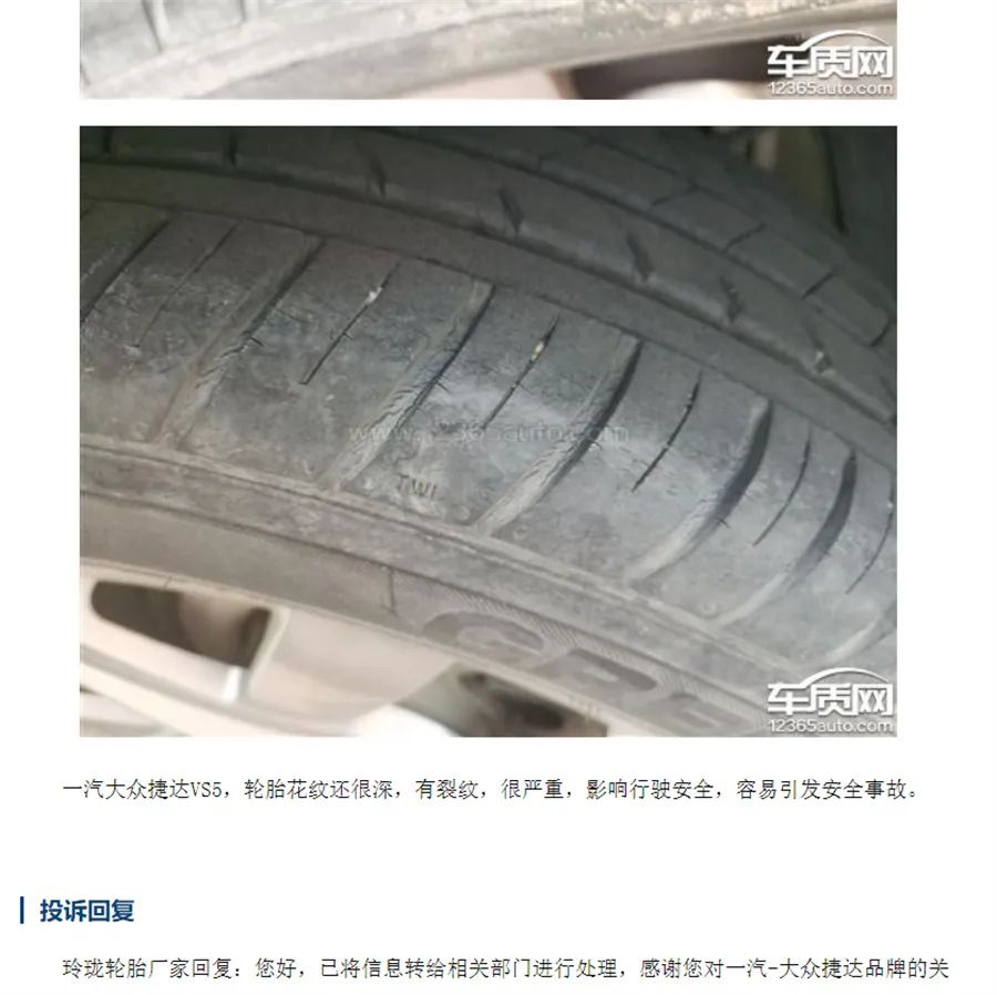 “一汽大众捷达VS5,轮胎花纹还很深,有裂纹,很严重,影响行驶安全,容易引发安全事故”;