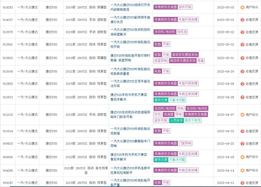 但从某些方面或许也能看出,捷达的确是一汽-大众的“廉价”子品牌,比如轮胎。从捷达VS5的投诉来看,涉及最多的就是轮胎裂纹的问题,据车质网数据,2019款捷达VS5的轮胎投诉高达341条,为所有类别投诉最高。
