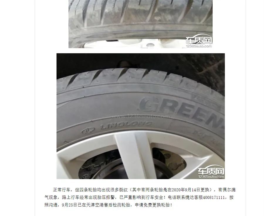 正常行车,但四条轮胎均出现很多裂纹(其中有两条轮胎是在2020年9月14日更换),有偶尔漏气现象,路上行车经常出现胎压报警,已严重影响到行车安全……