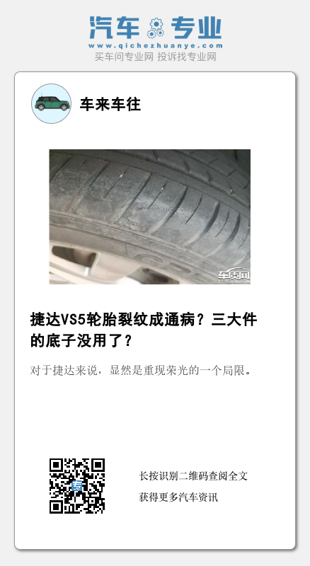 “不到一年,四条轮胎都出现裂纹,4S店说轮胎质保6个月,还说质量没问题”,一汽-大众捷达2022款VS5车主在车质网中投诉称。事实上,捷达VS5轮胎裂纹的问题早有出现,此前多集中于2019款车型上,没想到就连2022款车型也遭了灾。