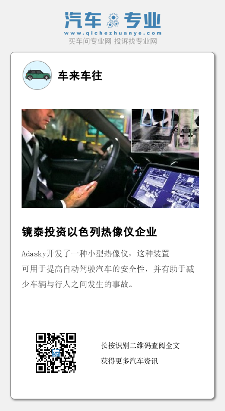 据外媒报道,高科技后视镜、可调光玻璃和汽车电子产品供应商镜泰将投资以色列企业Adasky,并与该公司进行合作。Adasky开发了一种小型热像仪,可用于提高自动驾驶汽车的安全性,并有助于减少车辆与行人之间发生的事故。