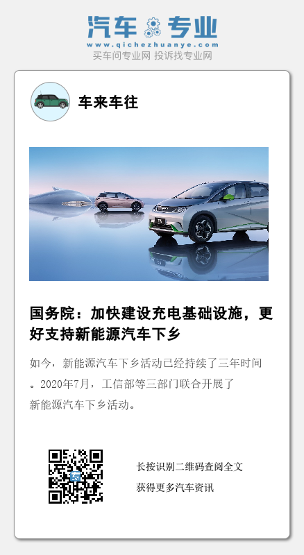 会议强调,要聚焦制约新能源汽车下乡的突出瓶颈,适度超前建设充电基础设施,创新充电基础设施建设、运营、维护模式,确保“有人建、有人管、能持续”。要引导企业下沉销售服务网络,鼓励高职院校面向农村培养维保技术人员,满足不断增长的新能源汽车维修保养需求。要进一步优化支持新能源汽车购买使用的政策,鼓励企业丰富新能源汽车供应,同时加强安全监管,促进农村新能源汽车市场健康发展。