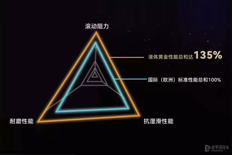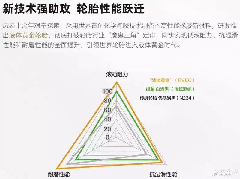 液体黄金轮胎与传统轮胎相比,综合性能更优异,降低轮胎滚动阻力的同时,提升轮胎的抗湿滑性能和耐磨性能,在西班牙IDIADA、史密斯实验室、TUV南德、中国橡胶工业协会等国内外权威机构的专业测试中表现卓越。目前,该技术因打破“魔鬼三角”被誉为“世界橡胶轮胎工业第四个里程碑式的技术创新”。
