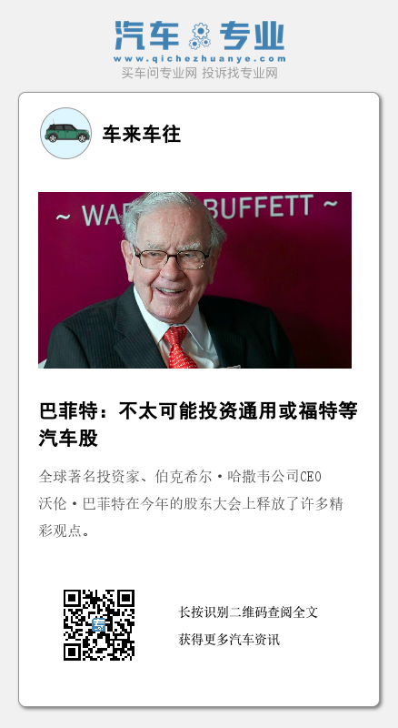 对于汽车行业,他直言,“很长一段时间里,我和查理(查理·芒格,伯克希尔·哈撒韦的副主席)都觉得,汽车行业实在太艰难了。”从历史上来看,汽车行业非常艰难,虽然汽车行业不会消失,但5到10年后汽车行业肯定和现在不一样,不论是汽车架构还是市场结构。