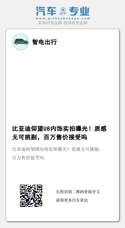 智电出行获得了仰望U8(图片)的内饰实拍图。新车分为豪华版与越野玩家版,共两个版本,预售价均为109.8万元,预计今年9月份开始交付。新车搭载云辇-P系统,可实现车身高度自主调节。中控屏采用独创的12.8英寸OLED面板曲面屏,配合37度的倾斜角度;同时配备带智能随动功能的打孔式Nappa真皮座椅。