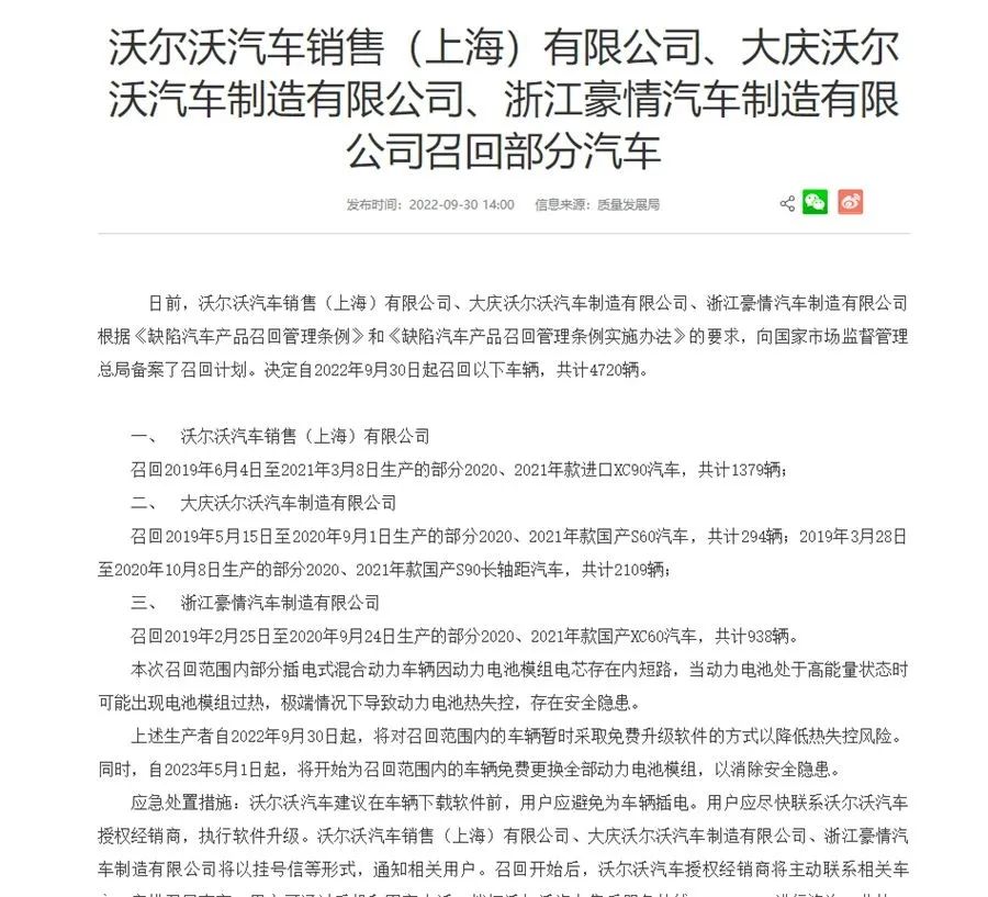 两起事故发生后,沃尔沃后续并未对外公布调查结果。不过,去年9月,沃尔沃召回包括部分2020、2021年款进口XC90汽车,部分2020、2021年款国产S60轿车,部分2020、2021年款国产S90长轴距汽车,共计4720辆,全为插混车型。