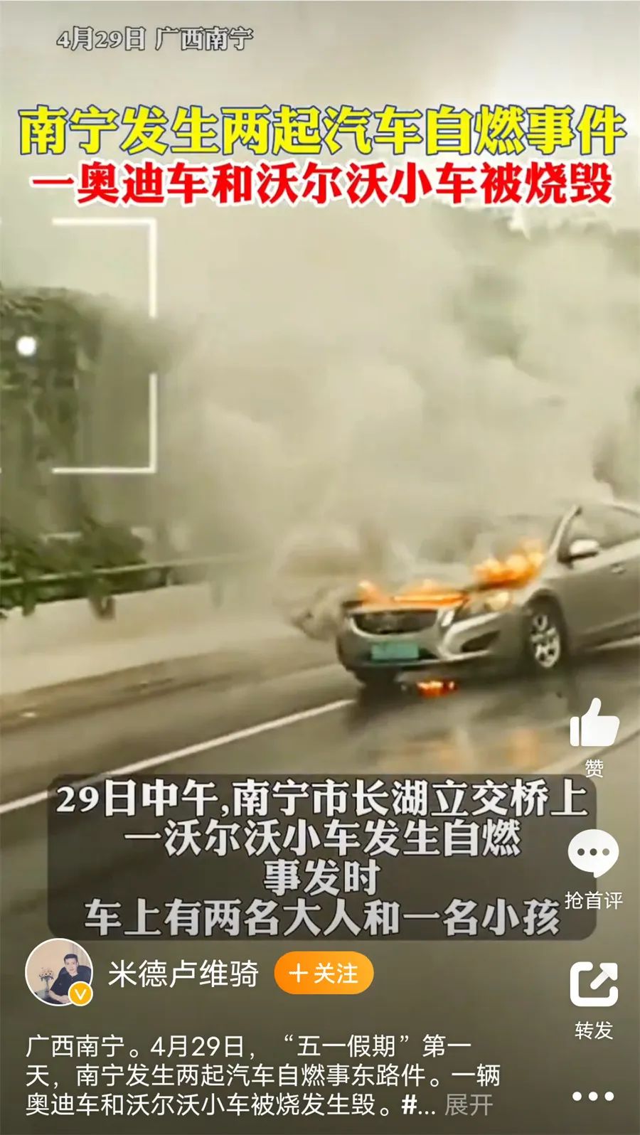 就在沃尔沃那场“傲慢与偏见”的发布会结束不到一个月后,互联网科技博主米德卢维骑发布视频称,4月29日中午,广西南宁长湖立交桥上,一辆沃尔沃小车发生自燃,事发时,车上有两名大人一名小孩。据了解,着火小车车龄十几年,车辆行驶至事发路段时,车上人员闻到一股油味,接着小车冒烟起火。