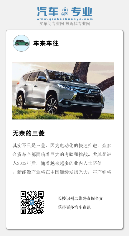 其实不只是三菱,因为电动化的快速推进,众多合资车企都面临着巨大的考验和挑战。尤其是进入2023年后,随着越来越多的业内人士坚信,新能源产业将在中国继续发扬光大,年产销将达到一个新的高度,事关合资车企的未来生存,堪比一场战争。