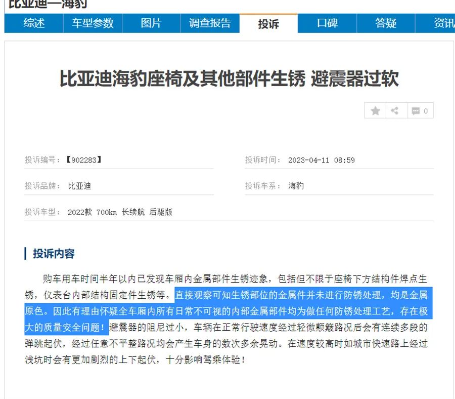 当然这类问题算不得“大事”,毕竟价格变动并不涉及产品质量问题。不过,这不意味着比亚迪可以高枕无忧,《汽车专业网》编辑注意到,在比亚迪海豹的投诉栏中,座椅生锈等有关品控的问题也渐渐多了起来。