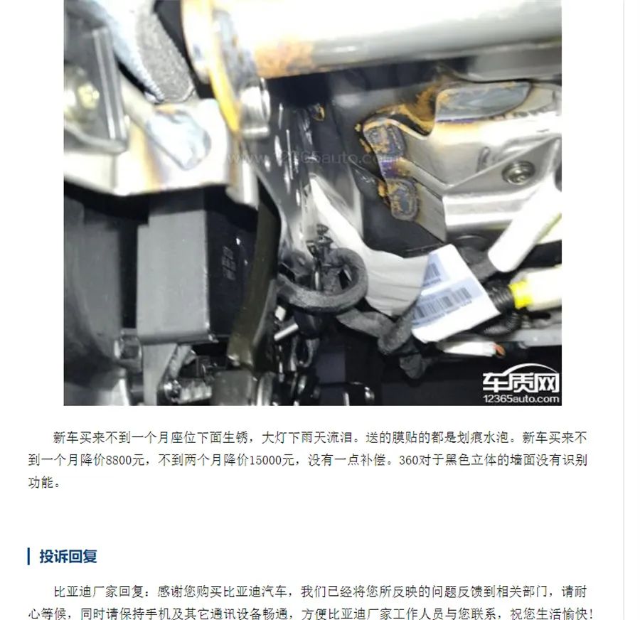 但这些问题并不可怕,而可怕的是出现集中性的、有关产品质量的投诉。《汽车专业网》编辑注意到,在比亚迪海豹的投诉栏中,“生锈”一词成了“降价”之外最高频的词汇,不少海豹车主在投诉中提到比亚迪海豹座椅下方结构件焊点生锈,仪表台内部结构固定件生锈等有关车身生锈的问题。