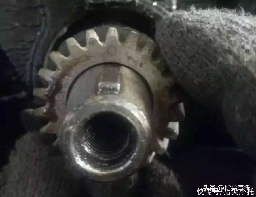 打开磁电机侧盖,取下磁电机转子,电启动超越离合器大齿轮等零部件,检查曲轴正时齿轮与凸轮齿轮的正时标记是否对齐。却发现正时齿轮组上均没有打正规的正时标记,只有凸轮齿轮上有手工补打的正时标记。