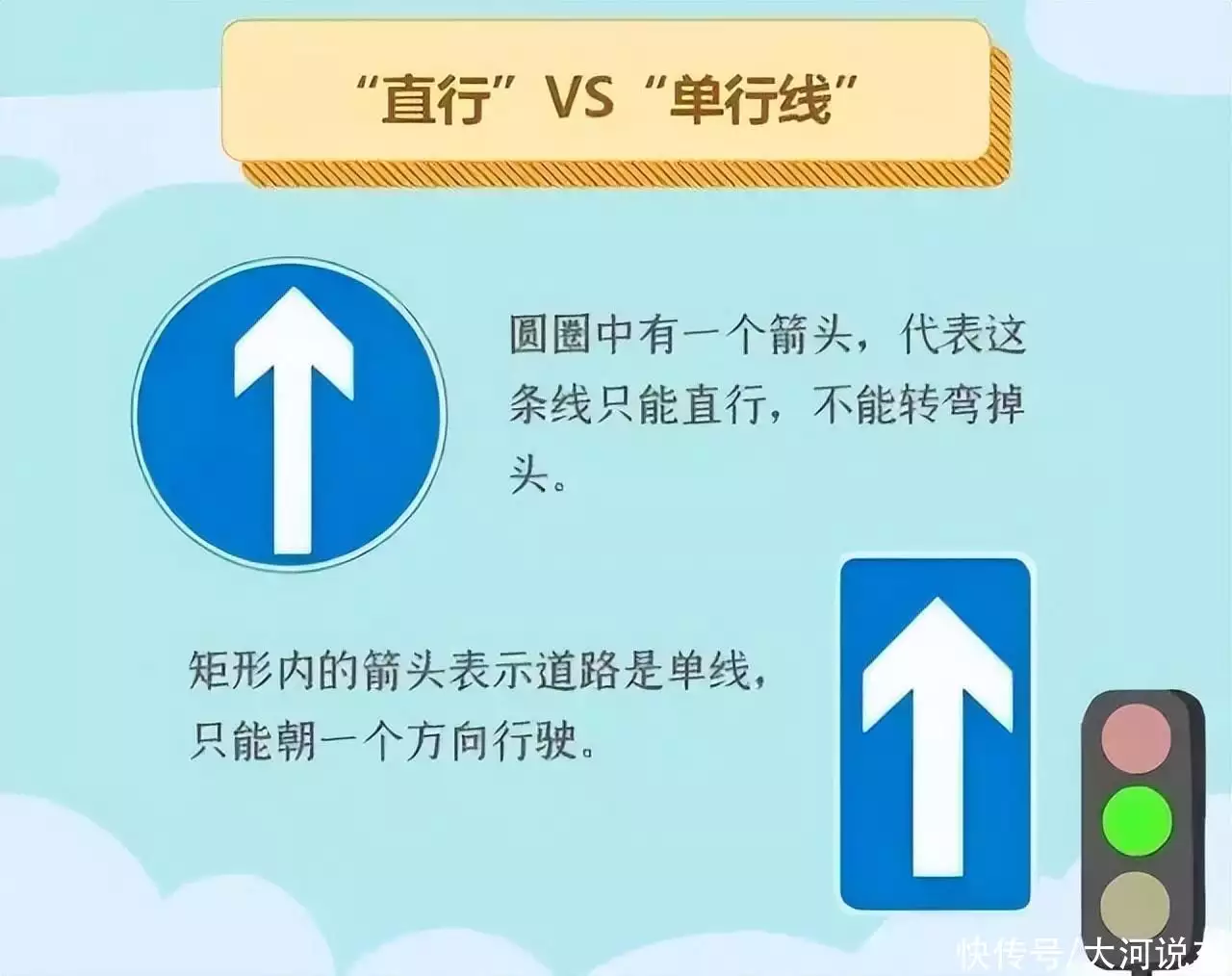 (2)不要把直行标志和单行道标志弄混了。(边框形状不同)