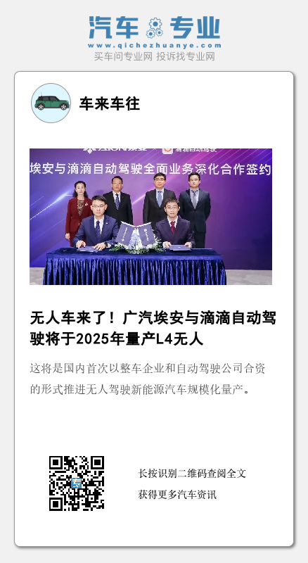 根据规划,该量产车将于2025年接入滴滴共享出行网络,实现全天候、规模化的混合派单,推动L4商业化加速落地。合资公司还将与广汽集团及滴滴出行旗下各投资企业开展成果应用合作,共同加速行业进步。