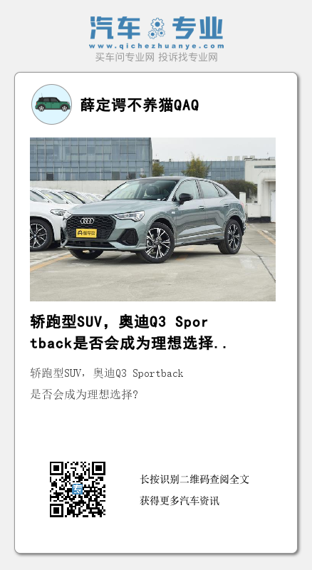 总的来说,奥迪Q3 Sportback在遵循家族设计语言的同时,通过较为运动化的造型,更加满足消费者对新生活新体验的要求。如果您追求产品本身带来的体验与满足,奥迪Q3 Sportback会是一个不错的选择。
