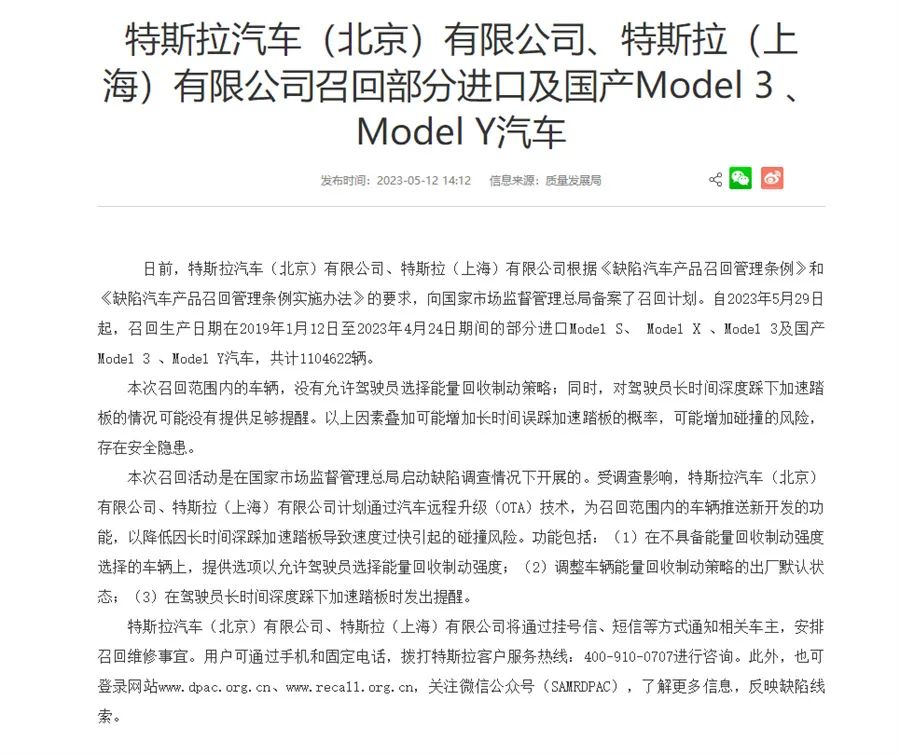 在持续多年的质疑声中,特斯拉终于低下了高贵的头颅,从教育消费者变成被监管总局教育。日前,特斯拉宣布召回自2019年1月12日至2023年4月24日期间的部分进口Model S、Model X、Model 3及国产Model 3、Model Y汽车,共计1104622辆。这算是官方公开承认了此前发生的“刹车失灵”事件跟强制单踏板模式有一定关系。