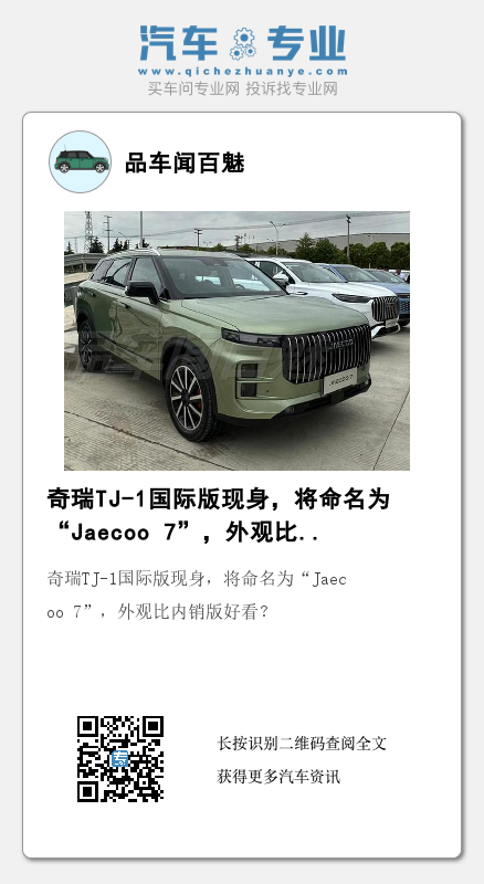 众所周知,在各位自主车企的共同努力之下,已经在国内汽车市场彻底扭转了被外资品牌挤压的局面。那么,已经在本国汽车市场获得不俗销量的前提之下,自然也让各大自主车企有了进军海外市场的底气!这其中,作为“国产技术流”典型代表的奇瑞,在2022年依靠着45万台新车出口量的成绩,也让其实现了连续20年位居中国品牌乘用车出口第一名的“宝座”!甚至于,为了进一步拓展海外市场,奇瑞旗下一款定位为轻型城市越野的紧凑型SUV,在内销版本尚处于“TJ-1”代号的前提之下,就已经有了远销海外的国际版车型。并且,计划于销往东南亚、欧洲、美洲等地的奇瑞TJ-1国际版,还被赋予了“Jaecoo 7”的名字。