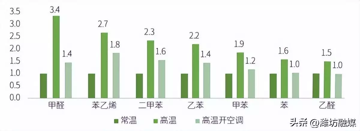 高温模式下的挥发性有机物测评结果不如人意,浓度平均为常温下的2倍。甲醛、乙醛、二甲苯和苯乙烯分别为常温模式的3.8倍、1.5倍、2.3倍和2.7倍。由此可见,消费者“温度越高,车里味道越大”的朴素感知与测试结果相符,高温下的车内污染问题亟待解决。