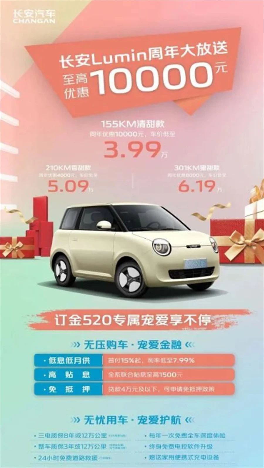 车主们所说的长安Lumin降价活动来自于长安汽车官方5月11日发布的降价消息,海报显示,旗下微型电动车Lumin(糯玉米)周年大放送,至高优惠1万元,优惠后价格为3.99-6.19万元。