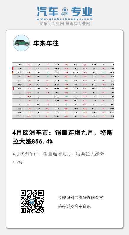 4月欧洲新车销量:特斯拉大涨856.4%