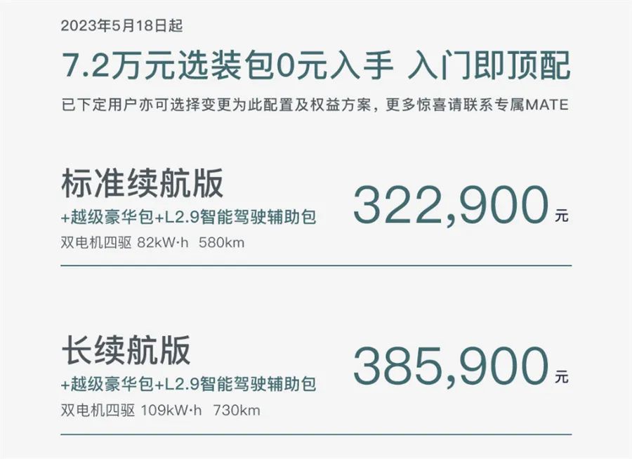 从岚图追光的调整来看,岚图追光的车型数量由三款缩减至了两款,仅保了留标准续航版及长续航版两款车型,售价分别为32.29万元和38.59万元,不仅降低了车辆售价降到40万元以内,更限时开放7.2万元选装包的免费选装,辅助驾驶、空悬等配置均包含在其中。仅从权益调整来看,岚图追光的做法属于典型的“增配不增价”,而对应的效果也就是岚图追光的“性价比”更高了。