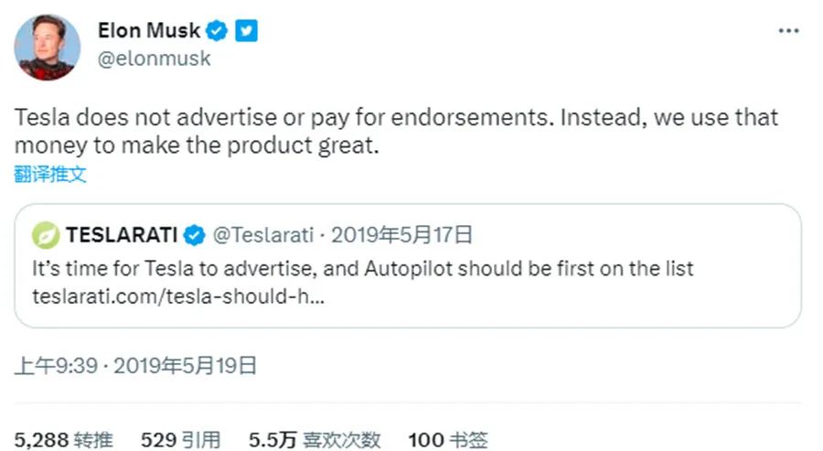 要知道,一直以来,特斯拉是反对投放广告的。在2019年的一条推文中,马斯克曾写道:“特斯拉不打广告,也不为名人代言花钱。相反,我们用这些花费来制造优秀产品。”虽然特斯拉的粉丝曾不止一次建议马斯克给特斯拉投广告,但马斯克长期以来都明确表示,他讨厌广告。
