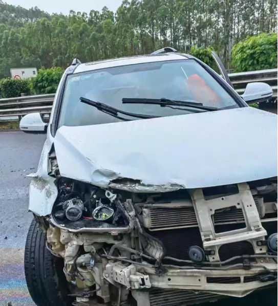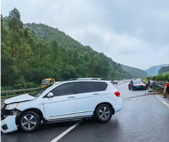 交警:您好,请问您是桂ADXXXX的车主吗?您的车刚刚在高速路上发生了三车连续碰撞的事故。