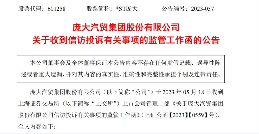 所谓“屋漏偏逢连夜雨”,*ST庞大濒临退市之际,又收到了上交所的监管工作函,*ST庞大及控股股东、实际控制人再遭“重击”。5月18日晚,*ST庞大公告称,收到上交所向公司下发的关于收到信访投诉有关事项的监管工作函。该监管工作函显示,有投资者投诉称,公司及控股股东、实际控制人存在掏空上市公司现金和资产、利用退市逃避重整业绩承诺、上市公司虚假回购等违规事项。