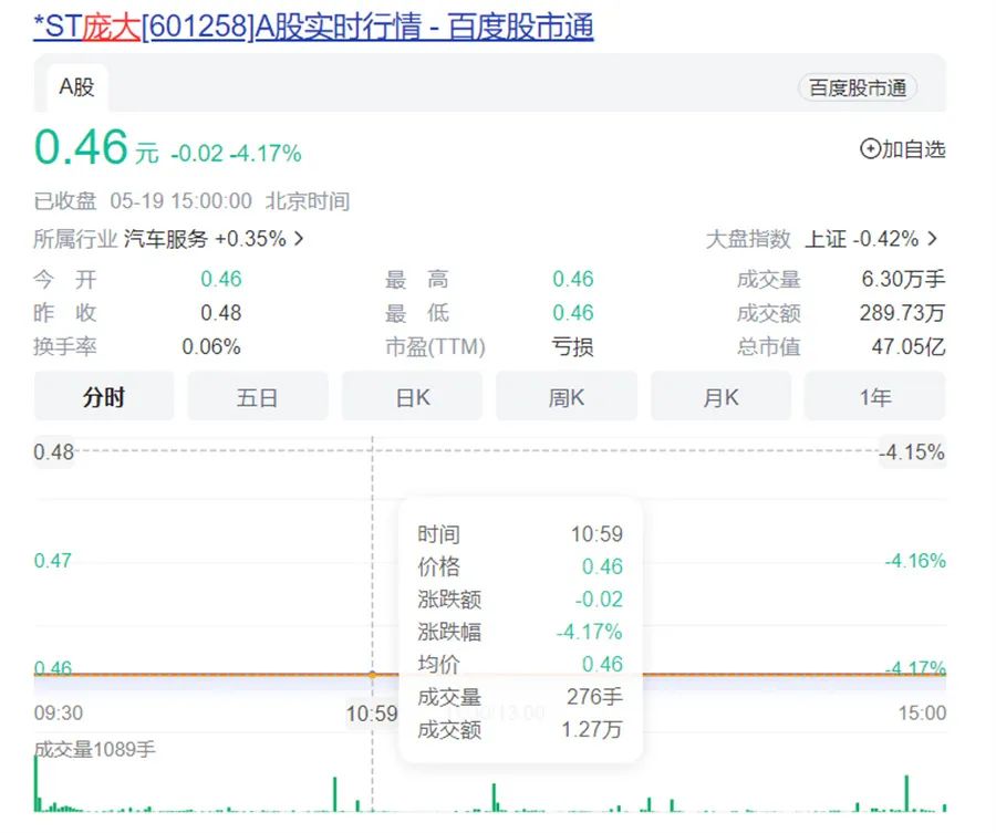 【文/财圈社&道哥说车 听风吟】完成重整仅三年多,昔日“汽车经销商第一股”——庞大集团长达12年的A股之路或即将走完。5月19日,*ST庞大再次跌停,报收0.46元/股,这也意味着,*ST庞大于4月22日首次披露面值低于1元或触及退市条款之后,连续17个交易日收盘价低于人民币1元。即使后续3个交易日连续涨停,也将因股价连续20个交易日低于1元面值而触及交易类退市指标,进入终止上市程序。