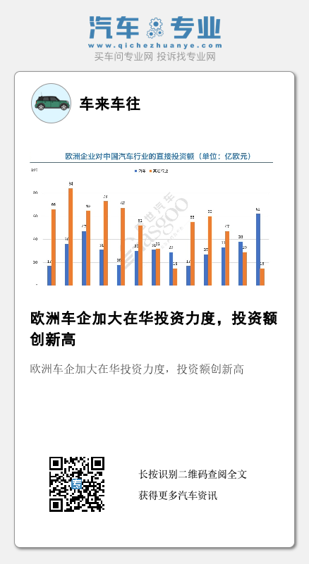 这一结果与2018年的数据形成了鲜明的对比。那一年,欧洲企业对中国汽车行业的投资额为17亿欧元,而其他行业的投资总额为55亿欧元。