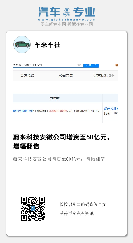 天眼查App显示,蔚来汽车科技(安徽)有限公司发生工商变更,注册资本由30亿增至60亿,增幅100%。
