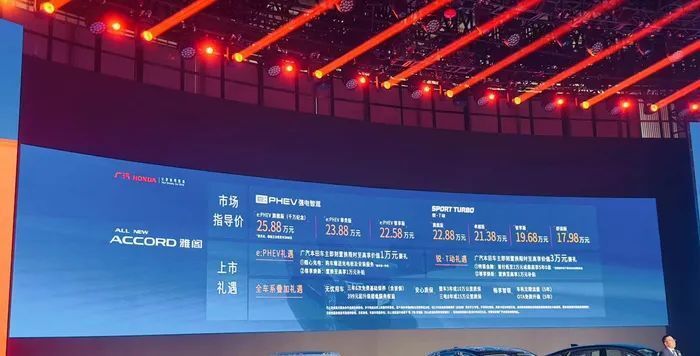 全新雅阁官方指导价为17.98-25.88万元,总共分为7个配置,动力有汽油版以及上文提到的e:PHEV插混版,其中燃油版有四个配置,售价区间为:17.98-22.88万元,搭载全新1.5T发动机,匹配CVT变速箱。e:PHEV插混版有三个配置,入门版价格与燃油版顶配接近,售价区间为:22.58-25.88万元。