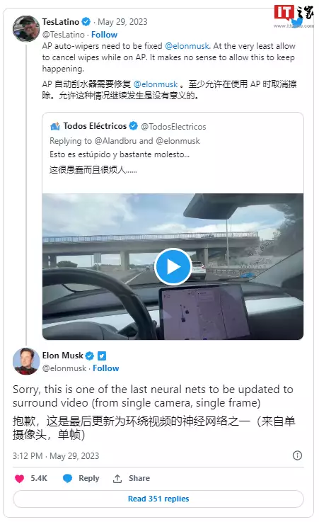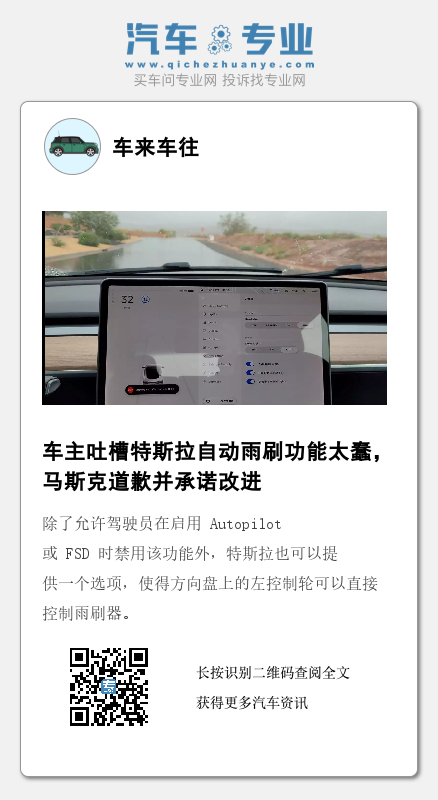 马斯克对这个请求做出了回应,并对该功能表现不佳表示了歉意。马斯克解释说,自动雨刷是最后一个升级到环绕视频(从单摄像头、单帧)的神经网络之一,所以未来的更新中应该会看到该功能的改进。
