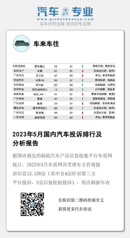 据国内领先的缺陷汽车产品信息收集平台车质网统计,2023年5月车质网共受理车主有效投诉信息13,139宗(其中含4宗针对第三方平台投诉,3宗后装轮胎投诉),再次刷新年内月投诉量最高纪录,环比上涨11.6%,同比上涨15.2%。今年1-5月累计投诉量达53,540宗,较去年同期上涨11.4%。