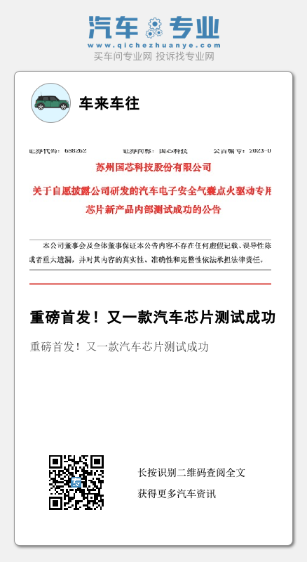 今日,国芯科技官方微信公众号也公布了该消息,国芯科技称,此次研发的汽车电子安全气囊点火驱动专用芯片CCL1600B在苏州由该团队内部测试成功,这标志着国内首款汽车电子安全气囊点火驱动专用芯片研发成功。
