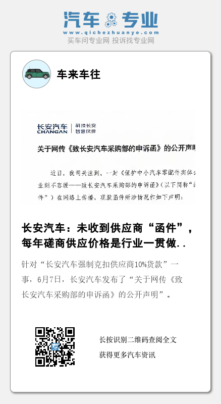 针对“长安汽车强制克扣供应商10%货款”一事,6月7日,长安汽车发布了“关于网传《致长安汽车采购部的申诉函》的公开声明”。