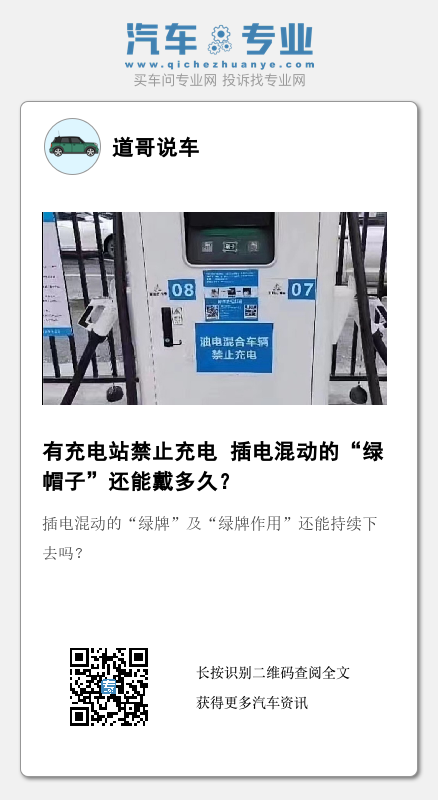 需要明确的是,这类问题完全是充电站的自主规定,与国家政策没有任何关系。不过,一个现实却是,同为新能源车型,插电混动车型的确有了“被针对”的意思,从北京限行包括插电混动车型,到上海停止为插电混动车型免费发放牌照,插电混动车型的“绿牌”作用越来越小。