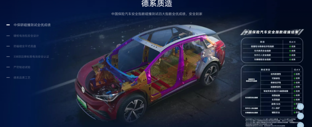 上汽大众ID.系列搭载的电池以三元锂为主,但安全性一直是其宣传侧重点。官网宣传资料显示,其曾获中保研碰撞测试全优成绩,并通过包括温度冲击、化学腐蚀、极端碰撞等338项电池安全测试项目,在电池包、底盘设计、制动实验都符合标准以确保车身安全。