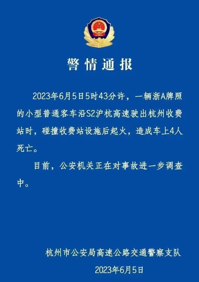 6月5日,杭州市公安局高速公路交通警察支队发布警情通报称,6月5日5时43分许,一辆浙A牌照的小型普通客车沿S2沪杭高速驶出杭州收费站时,碰撞收费站设施后起火,造成车上4人死亡。目前,公安机关正在对事故进一步调查中。