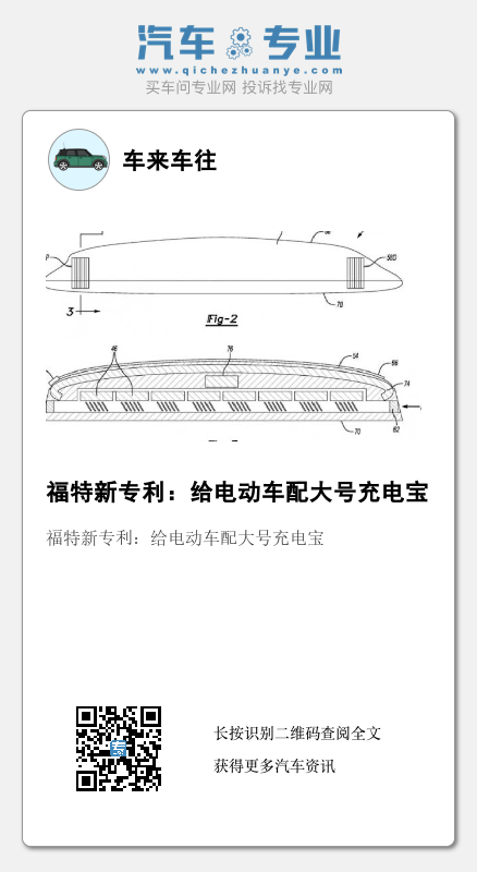 福特近日在美国专利商标局提交了一项专利,在电动汽车的车顶位置安装外置电池,为主电池组充电,同时还支持车主自行安装和拆卸。