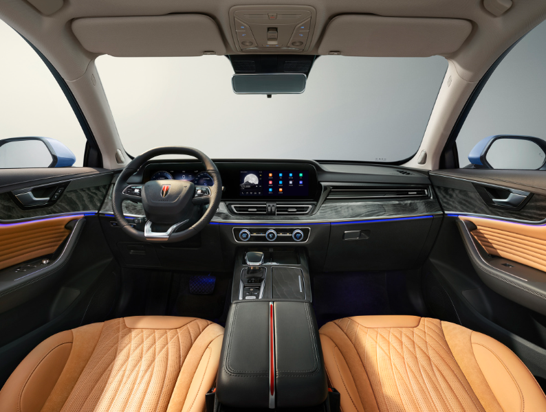 内饰采用了环抱式设计,门板线条勾勒行云流水,木纹饰板提升了档次。两联屏设计,尺寸达到12.3英寸,车联网、4G网络、OTA升级、WiFi热点皆有。