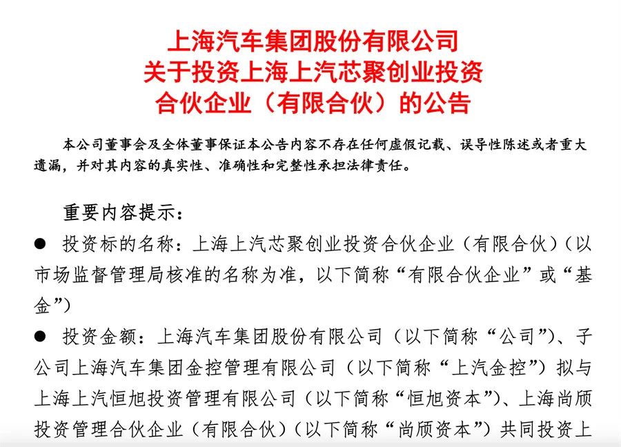 【文/财圈社&道哥说车 听风吟】6月19日,上汽集团公告称,计划与子公司以及关联方共同出资60.12亿元,共同投资上海上汽芯聚创业投资合伙企业(有限合伙),其中上汽集团认缴出资60亿元,持有其99.800%份额。据公告披露,该基金将重点关注半导体产业链上下游、汽车智能化电动化网联化驱动下芯片相关的关键技术产品。