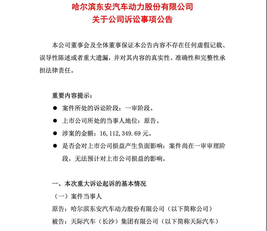 据东安动力公告,目前,一审法院已对天际汽车的相应资产采取了保全措施,公司决定公告该诉讼。公司请求法院依法判令天际汽车向公司支付货款1611.23万元并承担迟延付款的利息。