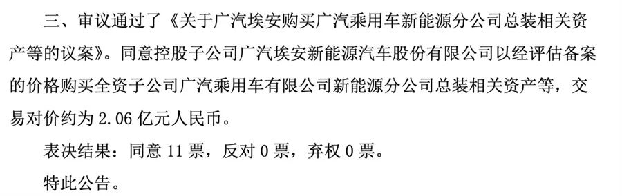【文/财圈社&道哥说车 听风吟】6月29日,广汽集团公告称,董事会审议通过了《关于广汽埃安购买广汽乘用车新能源分公司总装相关资产等的议案》,同意控股子公司广汽埃安新能源汽车股份有限公司以经评估备案的价格购买全资子公司广汽乘用车有限公司新能源分公司总装相关资产等,交易对价约为2.06亿元。