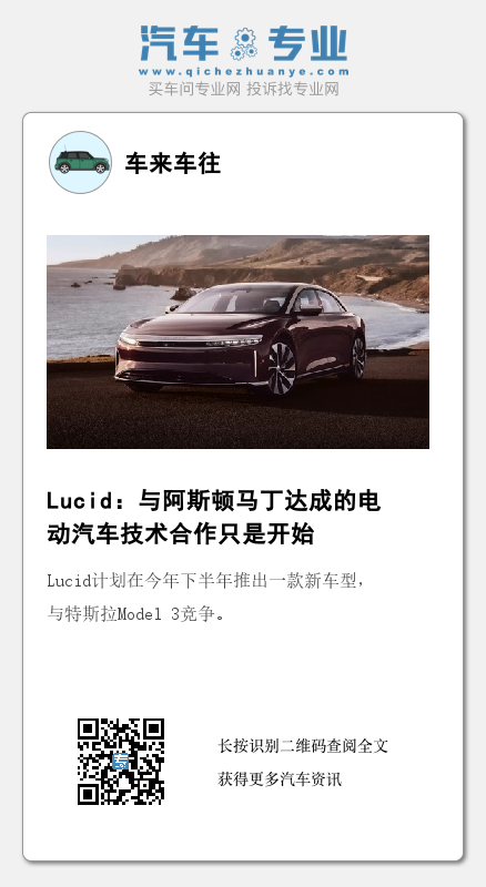 6月26日,Lucid宣布与英国豪华汽车制造商阿斯顿马丁达成合作,这家美国电动汽车企业将向后者提供技术,包括搭载双电机的后轮驱动装置、电池模块和用于整合系统的软件。这些零部件将来自Lucid位于亚利桑那州(Arizona)的工厂。