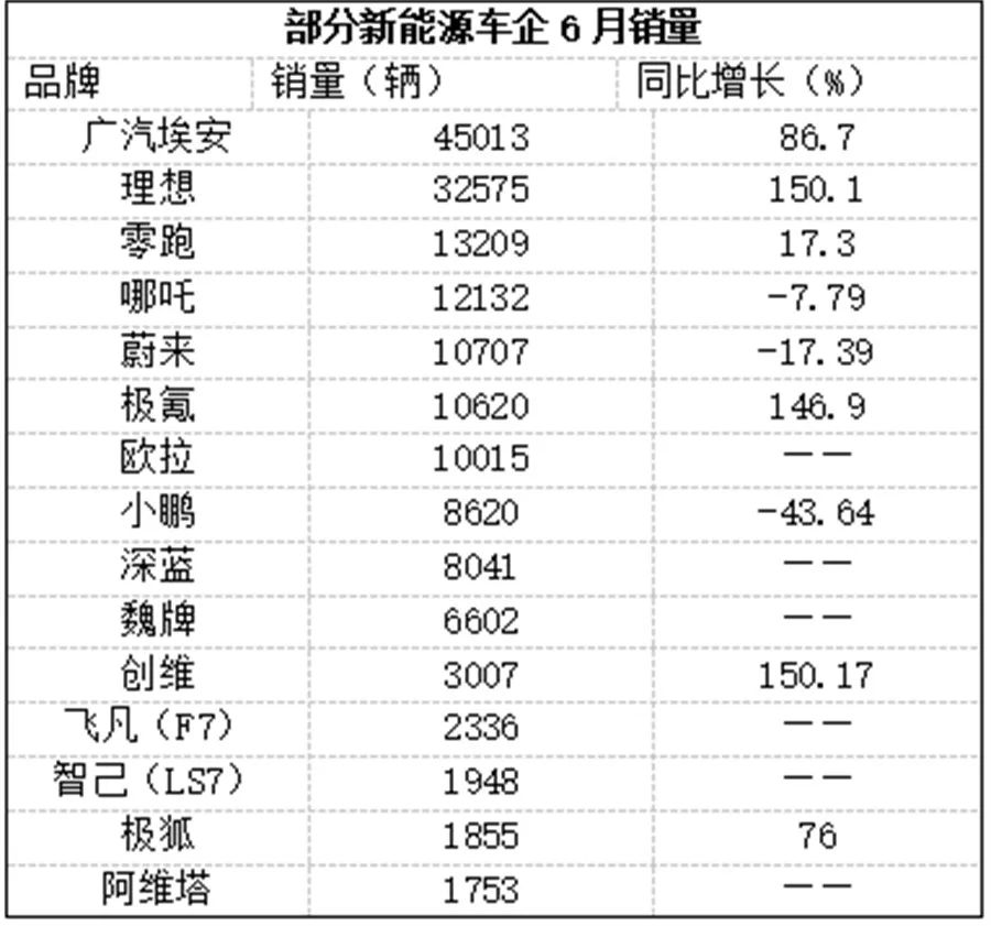 据《道哥说车》编辑统计,造车新势力中,理想、蔚来、哪吒、零跑6月销量均突破了万辆,其中理想一枝独秀,以超过3万辆的成绩领衔,蔚来也经历了两个月的低谷,重新回到万辆俱乐部。小鹏汽车实现了销量上的大幅回升,但仍没有突破万辆,创维等也没有突破万辆。