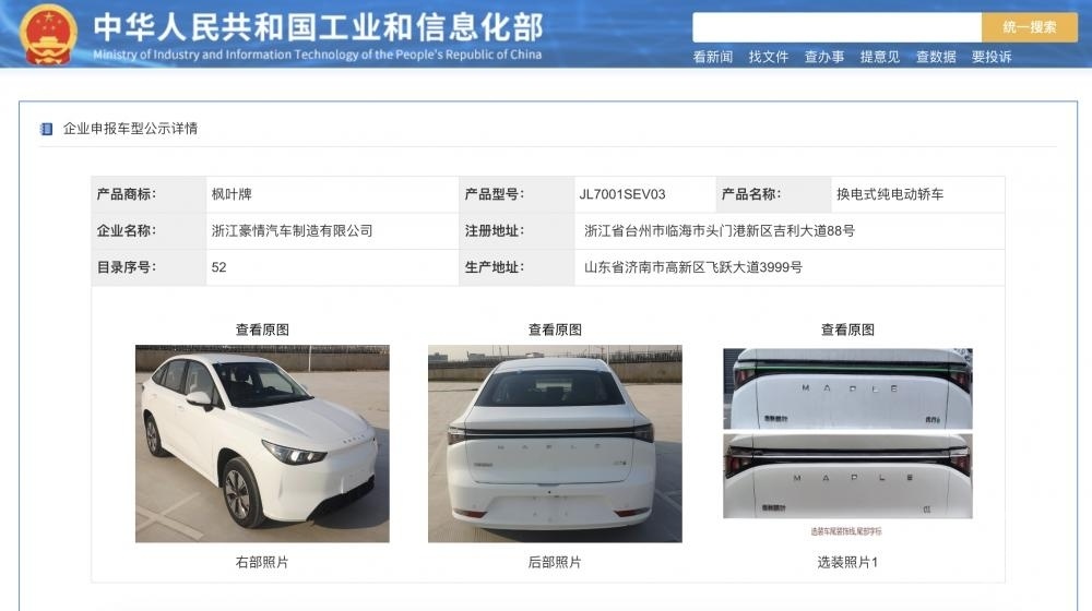 6月30日,一名网约电动车司机看到照片后告诉上游新闻记者:“这是吉利的枫叶汽车,可以换电池。”随后,记者登录工信部官网检索发现,从车标和外观来看,涉事车与浙江豪情汽车制造有限公司申报的枫叶牌汽车很相似,产品名称:换电式纯电动轿车。该车最大功率120千瓦,同时支持整车换电,其磷酸铁锂电池可按国家规定采用车电分离方式销售。