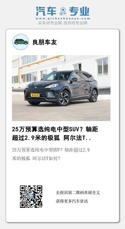 极狐 阿尔法T轴距超过2.9米,同级当中空间表现不错,7.8s的零百加速虽然不算极致,但实际动态体验无论动力响应、平顺性均能满足日常需求,底盘表现也具备一定的亮点,25万预算准备入手纯电中型SUV的消费者不妨考虑。
