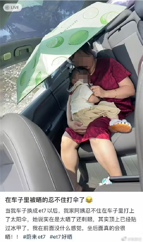 近日,有蔚来ET7车主发帖称,自家阿姨在乘坐车子出行时,为了避免被晒,在车里竟然打起了伞,原因在于是大天幕太晒而且还刺眼。