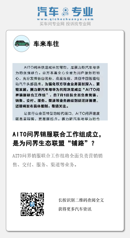 或许,这次AITO问界销服联合工作组成立,也是赛力斯与华为双方基于品牌的发展,基于华为构建汽车生态联盟的情况下,找到的一条适合双方合作的发展路径。